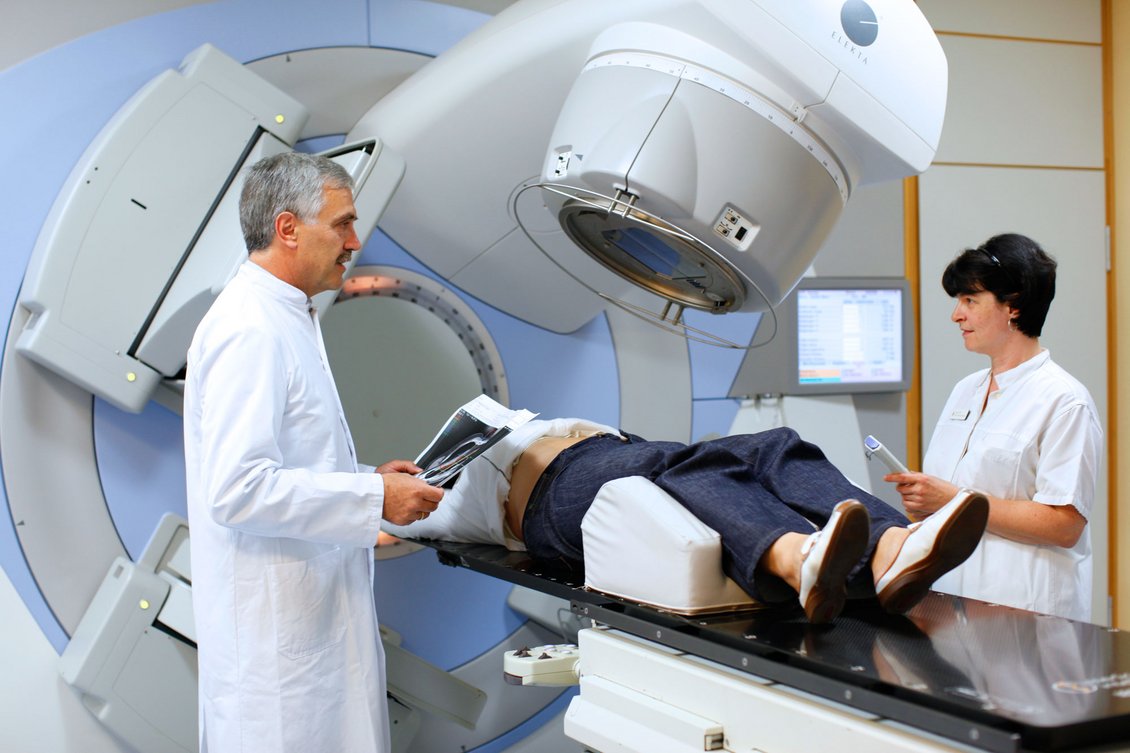 Beim lokal fortgeschrittenen Enddarmkrebs ist die Behandlungsstrategie eine andere: Immer dann, wenn sich in der radiologischen Bildgebung oder im Ultraschall eine Darmwandüberschreitung des Tumors oder Tumorabsiedlungen in Lymphknoten zeigen, ist eine Strahlentherapie sinnvoll. Dadurch wird die Wahrscheinlichkeit, dass der Tumor nach der Operation lokal wieder auftritt, wesentlich verringert. Studien beim Enddarmkrebs haben ergeben, dass die Strahlentherapie vor der Operation besser wirksam und verträglich ist als nach der Operation. Ob Sie in Ihrer individuellen Tumorsituation von einer vorgeschalteten Strahlentherapie profitieren und welches Behandlungsschema das Beste ist, wird in jedem Einzelfall in unserer fachübergreifenden Tumorkonferenz besprochen. Durch modernste Bestrahlungstechnik werden Nebenwirkungen minimiert.