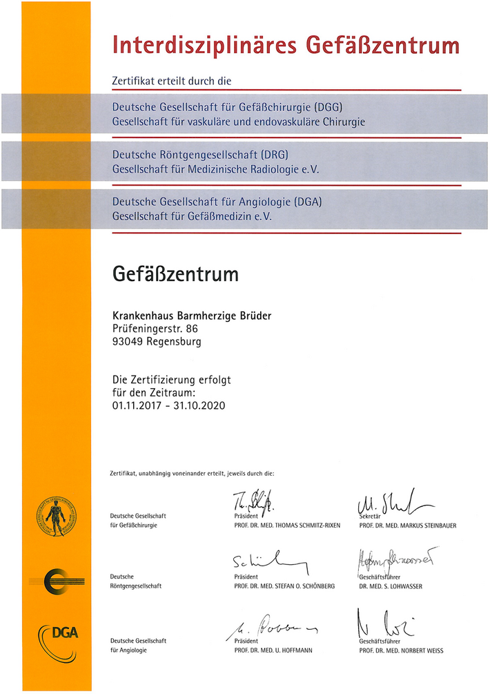 Dafür wurden wir als einziges Zentrum in Bayern von allen drei in der Gefäßmedizin tätigen Fachgesellschaften, „Deutsche Gesellschaft für Gefäßchirurgie“, „Deutsche Gesellschaft für Angiologie“ sowie „Deutsche Röntgengesellschaft“, mit dem Zertifikat „Gefäßzentrum (DGG, DGA, DRG)“ ausgezeichnet.