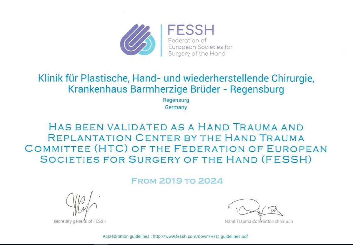 Das Hand Trauma Zentrum der Klinik für Plastische, Hand- und wiederherstellende Chirurgie erfüllt die von der Vereinigung der europäischen Fachgesellschaften für Handchirurgie (FESSH) geforderten hohen Standards für die medizinische Versorgung von Handverletzungen und die Durchführung komplexer mikrochirurgischer Operationen der oberen Extremität.