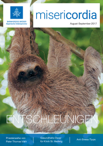 Unsere Ordenszeitschrift erscheint jährlich mit zehn Ausgaben. Neben vielen weiteren Ordens- und Krankenhausthemen haben wir in unserer Sommerausgabe einen smarten Einzelgänger zum Titelstar erkoren: Vom Faultier lernen wir, wie ein Leben in Zeitlupe ablaufen kann. „ENTSCHLEUNIGEN“ heißt die Doppelausgabe August/September und macht einige Vorschläge: Wie entspannen wir richtig? Ganzheitlich nach Pfarrer Kneipp oder wie der Kollege beim Radfahren? Der frühere Chefarzt der Palliativstation des Münchner Krankenhauses, Dr. Thomas Binsack, nahm nach 10 Jahren Aufbauarbeit ein Sabbatical und für die freie Zeit des Ruhestands hat er vorher sogar geübt, wie er im Interview verrät.