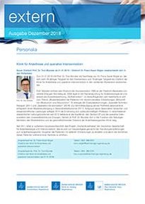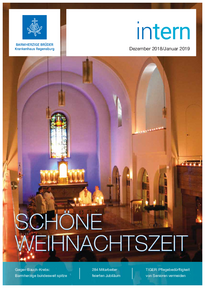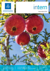 In der November-Ausgabe der intern erfahren Sie auf mehreren Sonderseiten Aktuelles zum Standort der Barmherzigen Brüder in der Prüfeninger Straße. Detaillierte Informatinen gibt es unter anderem über die Strategietagung 2018, das Managementreview 2018 BBPR/BBPG, das neue Zielehaus für 2018 - 2022 sowie über die Aktion "Wir arbeiten gemeinsam am Haus der Hospitalität". Weitere Themen der Ausgabe sind internes und extenes Feedback durch die Mitarbeiterbefragung und die FOCUS-Klinikliste 2019, das neue Programm zur Fort- und Weiterbildung sowie weitere Themen des Standortes Regensburg und auch Verbundweite Informationen.